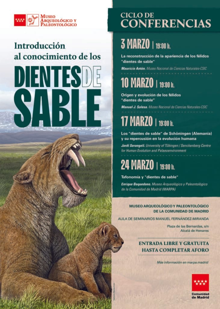 En el mes de marzo, el Museo Arqueológico y Paleontológico de la Comunidad de Madrid (MARPA) organiza el ciclo de conferencias Introducción al conocimiento de los “dientes de sable”, en el marco de la exposición temporal “Dientes de sable”, que podrá visitarse hasta el 25 de octubre de 2026. Esta serie de charlas científicas está dedicada a uno de los grupos de carnívoros más fascinantes de la prehistoria: los félidos “dientes de sable”. A lo largo de cuatro sesiones, destacados especialistas abordarán su apariencia, origen, evolución, comportamiento y relación con la evolución humana.