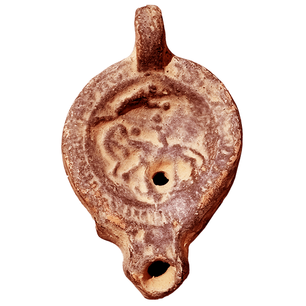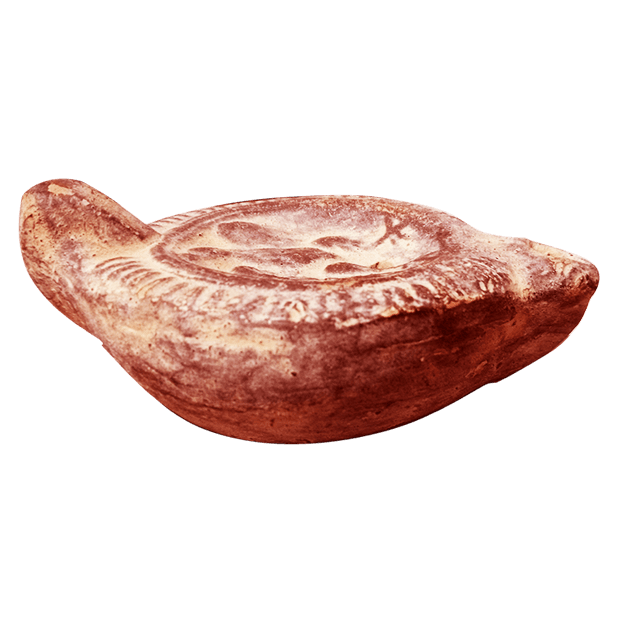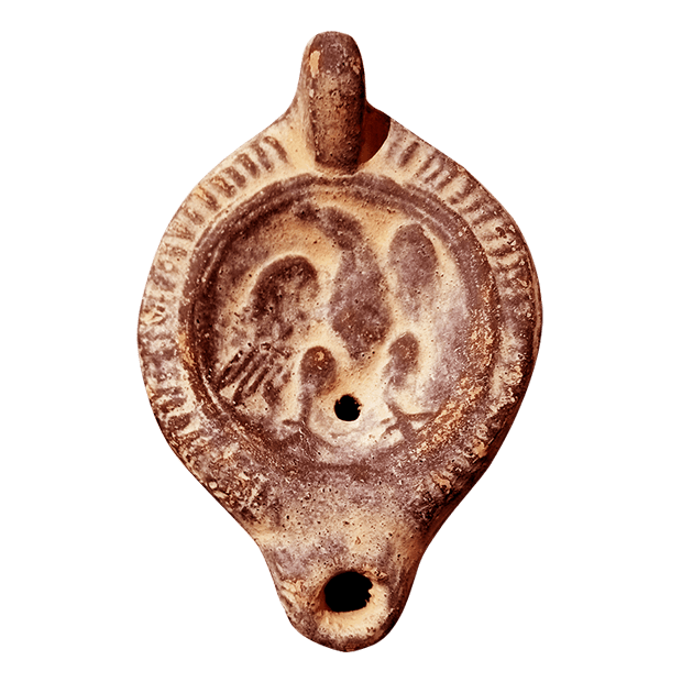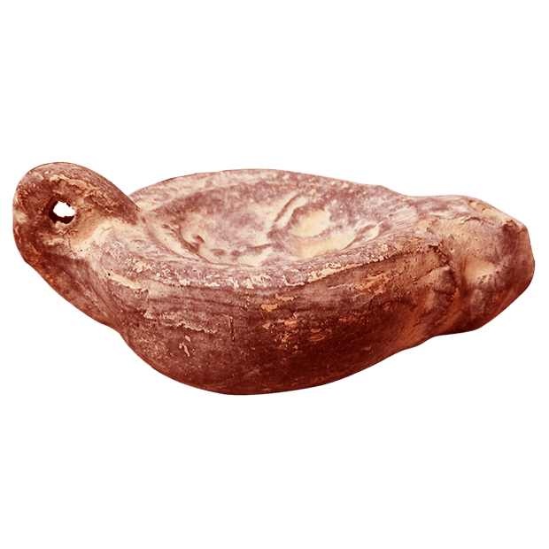 Reproducciones artesanales de lucernas romanas con imágenes de águila y de actividades ecuestres. Ambos modelos contienen dos orificios, uno para introducir el aceite y el otro más grande y en el extremo para la mecha, la cual se encendía empapado en aceite para iluminar. Ambos modelos cuentan con agarradera en el tremo para una mejor manipulación.