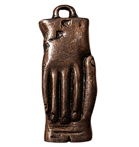 Reproducción artesanal de colgante de tésera de hospitalidad en zamak con inscripción en el reverso,  encontradas en el Castillo de Cedrillas (Teruel), el cual representa un pacto jurídico entre dos pueblos. El original se encuentra en el Museo Arqueológico Nacional (MAN) en Madrid. Representa dos manos entrelazadas en la cara anversa mientras que en el reverso aparece una inscripción incisa en latín.